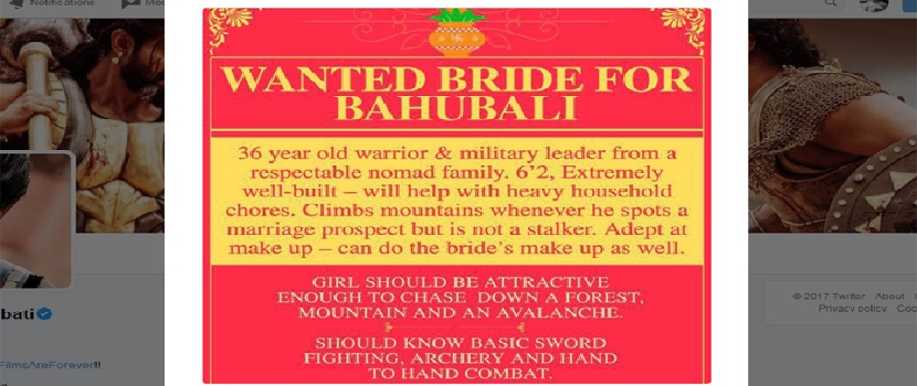 | भल्लालदेव ने बाहुबली की शादी के लिए दिया विज्ञापन, सोशल मीडिया पर हो गया वायरल | ||